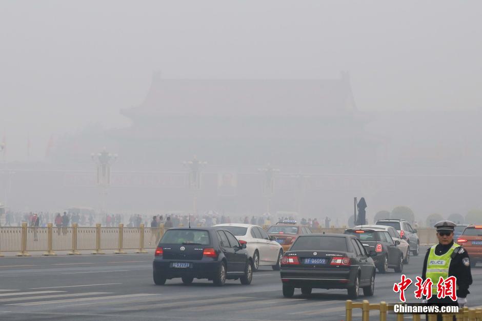 Visitors walk in the Tiananmen Square in the heavy smog. (Photo/CNS)