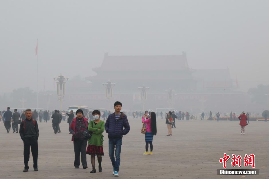 Visitors walk in the Tiananmen Square in the heavy smog. (Photo/CNS)