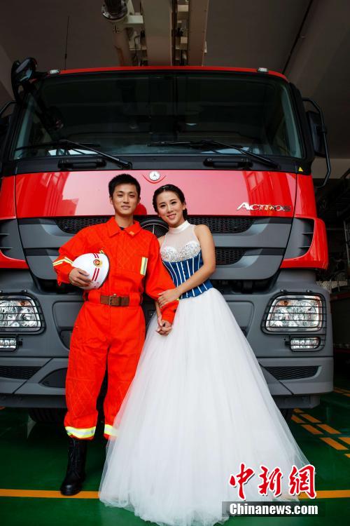 Wang Junwei, a firefighter in Huangdao District of Qingdao City, east China's Shandong Province, takes a group of wedding photos with his bride at his workplace, October 18, 2014. His colleagues, the fire trucks and the water hoses form a unique background for the photos. (CNSPHOTO/Jin Shaoyue)