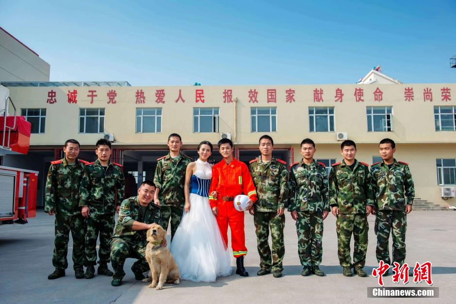 Wang Junwei, a firefighter in Huangdao District of Qingdao City, east China's Shandong Province, takes a group of wedding photos with his bride at his workplace, October 18, 2014. His colleagues, the fire trucks and the water hoses form a unique background for the photos. (CNSPHOTO/Jin Shaoyue)