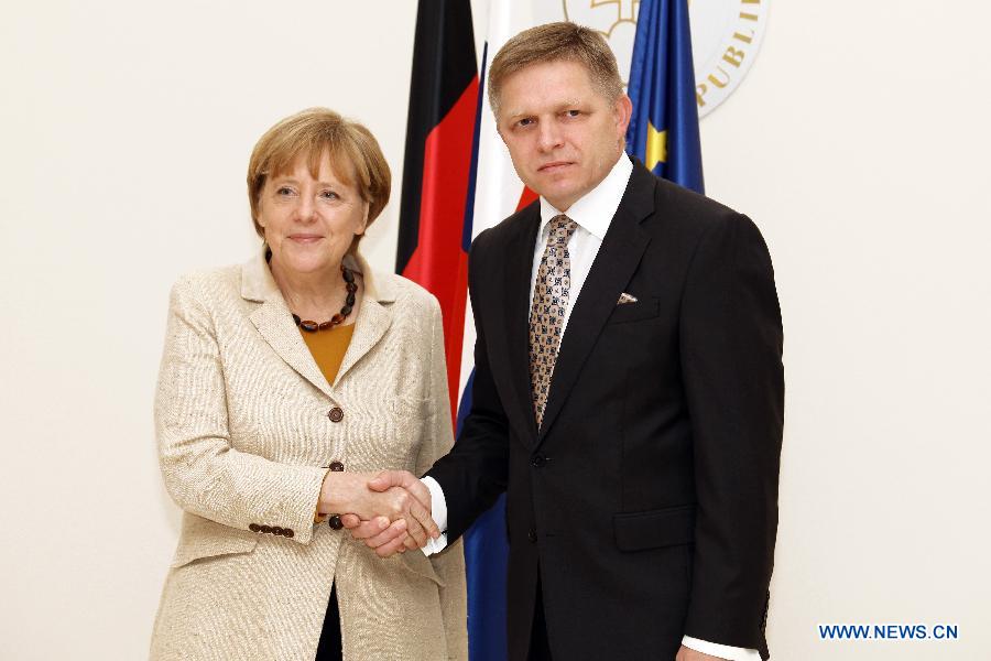 Slovakia's Prime Minister Robert Fico (R) shakes hands with German Chancellor Angela Merkel in Bratislava, Slovakia, on October 20, 2014, during Merkel's official visit to Slovakia. (Xinhua/Andrej Klizan)