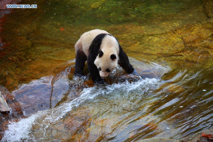 Photo taken on Oct. 19, 2014 shows a wild giant panda found at the Dajiangou scenic area in Huangbaiyuan Township in Taibai County of Baoji City, northwest China's Shaanxi Province. The wild panda appeared here on Sunday, according to a staff member of the local government. (Xinhua/Wang Li)