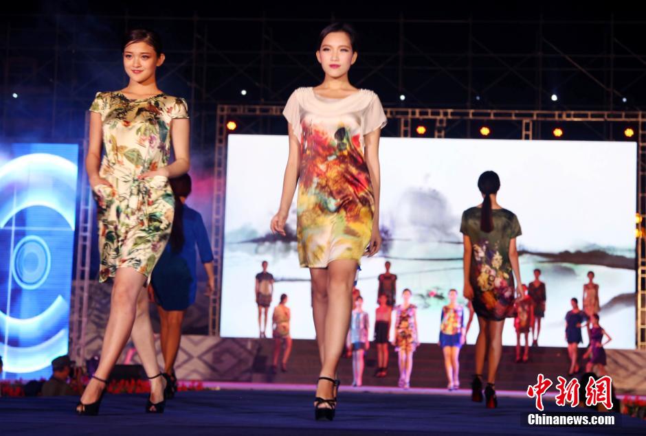 Photo taken shows models in ethnic costume on the stage in Yizhou, S China’s Guangxi Zhuang Autonomous Rgion, on the evening of October, 19, 2014. (Photo by Yang Zhixiong)