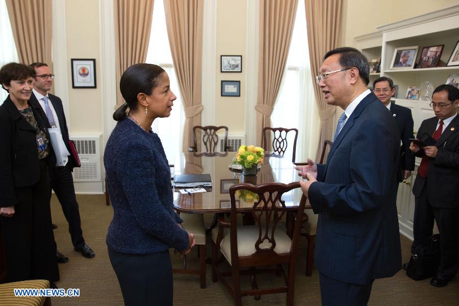 In a meeting at the White House, visiting Chinese State Councillor Yang Jiechi and U.S. National Security Advisor Susan Rice discussed the preparations for Obama's visit to Beijing in early November to attend the informal leadership meeting of the Asia-Pacific Economic Cooperation (APEC) and hold talks with Chinese President Xi Jinping.