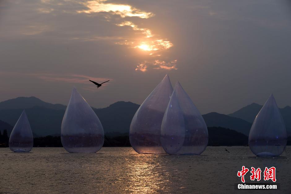 A one-week "Dancing Water Drops 2014" Art Exhibition kicks off in West Lake of Hangzhou, southeast China’s Zhejiang Province, Oct. 18, 2014. The whole group of works consists of five water drop models 12 to 20 meter in height floating on the lake and hundreds of small "water drops" placed on the park lawn, meaning "look at the world through water drops", to advocate the ecological concept of "protect water, love water, and cherish every drop of water". (CNSPHOTO/Li Zhong)