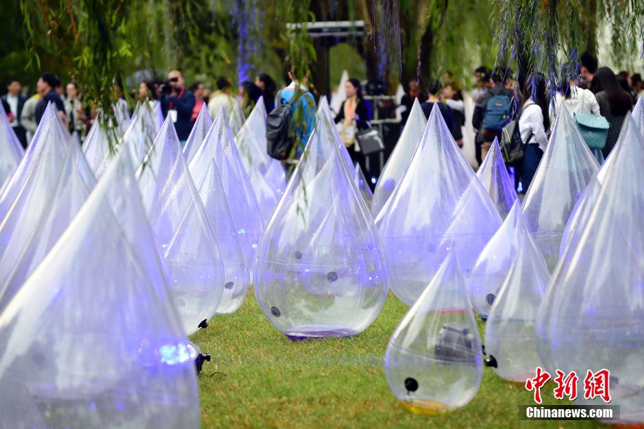 | A one-week "Dancing Water Drops 2014" Art Exhibition kicks off in West Lake of Hangzhou, southeast China’s Zhejiang Province, Oct. 18, 2014. The whole group of works consists of five water drop models 12 to 20 meter in height floating on the lake and hundreds of small "water drops" placed on the park lawn, meaning "look at the world through water drops", to advocate the ecological concept of "protect water, love water, and cherish every drop of water". (CNSPHOTO/Li Zhong) |