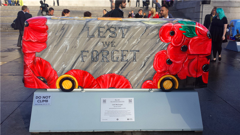 LONDON Oct. 21, People's Daily Online -- Twenty-eight New Routemaster bus sculptures were unveiled for the first time today in Trafalgar Square. These sculptures forms a collection of 60 bus sculptures, commissioned by Transport for London (TfL), which will be placed across London on four walking trails as part of the Year of the Bus Sculpture Trail. The first three trails will be installed for the public to enjoy from Monday 20 October with a fourth following for Christmas.