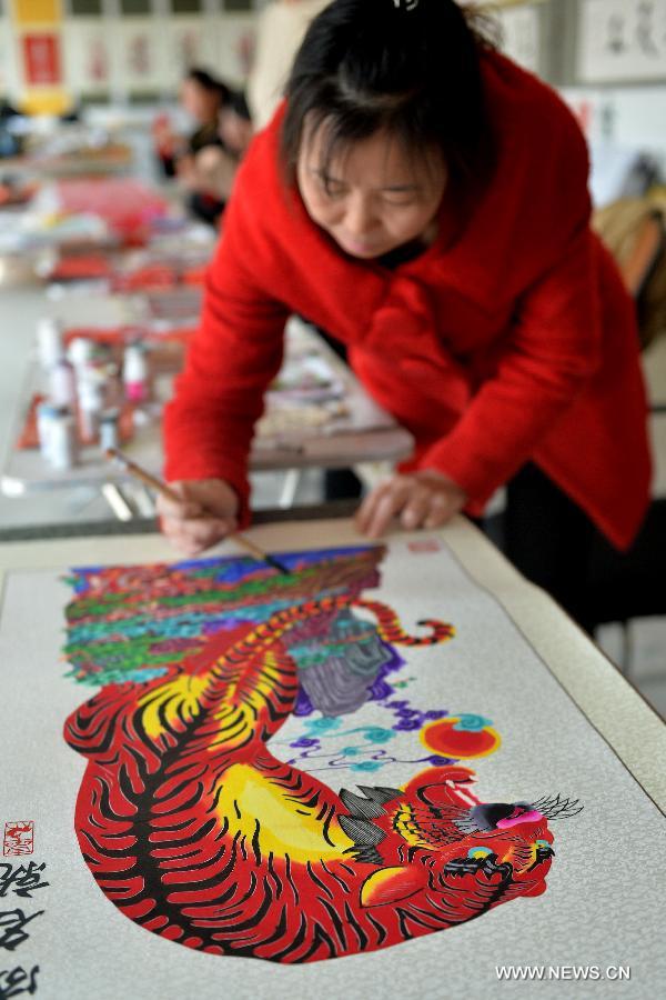A handicraftsman colours a paper cutting in a studio in the Hongshan Subdistrict of Jianping County, northeast China's Liaoning Province, Oct. 22, 2014. Paper cutting, the traditional Chinese folk art which uses red paper as material to make pictures by scissors, has been transfered from generation to generation in Jianping County and now has developed into a cultural industry. (Xinhua/Bai Tiejun)