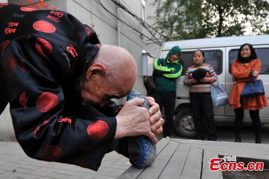 Zhang Chenglin, a 96-year-old man does a split during his morning exercise in a residential community in Taiyuan, Shanxi province on Tuesday, October 21, 2014. Zhang said he exercised every day by walking 1,000 steps. [Photo: China News Service/ Wu Junjie]