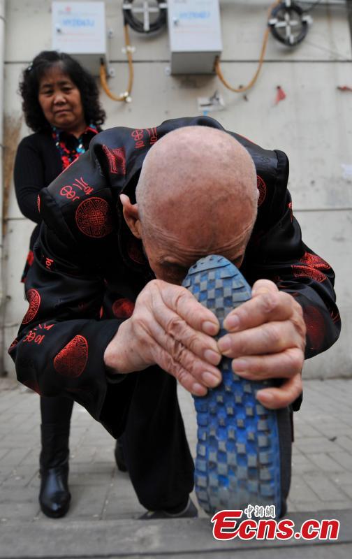 | Zhang Chenglin, a 96-year-old man does a split during his morning exercise in a residential community in Taiyuan, Shanxi province on Tuesday, October 21, 2014. Zhang said he exercised every day by walking 1,000 steps. [Photo: China News Service/ Wu Junjie] |