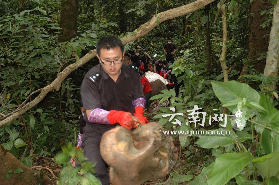 | A carcass of a male Asian elephant without tusks was found on Oct. 16 in the forest in Mengla area, southwest China's Yunnan province. The body was already decomposed, and the tusks had been removed. It was shot by a standard firearm. A task force has been formed by the Forest Public Security Bureau to investigate the case. A reward of about $6,500 was offered to anyone who can provide clues to the investigation. (Photo/Yunnan.cn) |