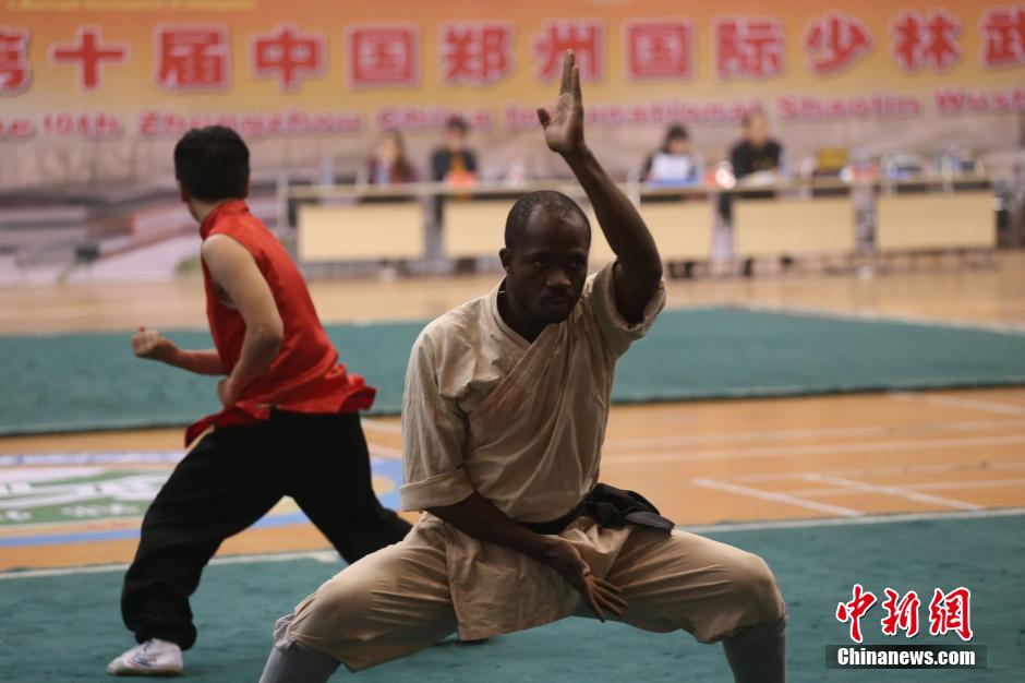 Competitor shows kung fu during the 10th Intl' Shaolin Wushu Festival in Dengfeng, central China's Henan province, Oct. 20, 2014. Nearly 2000 kung fu masters from 63 countries participated in the festival. (CNS/Yang Zhenghua)