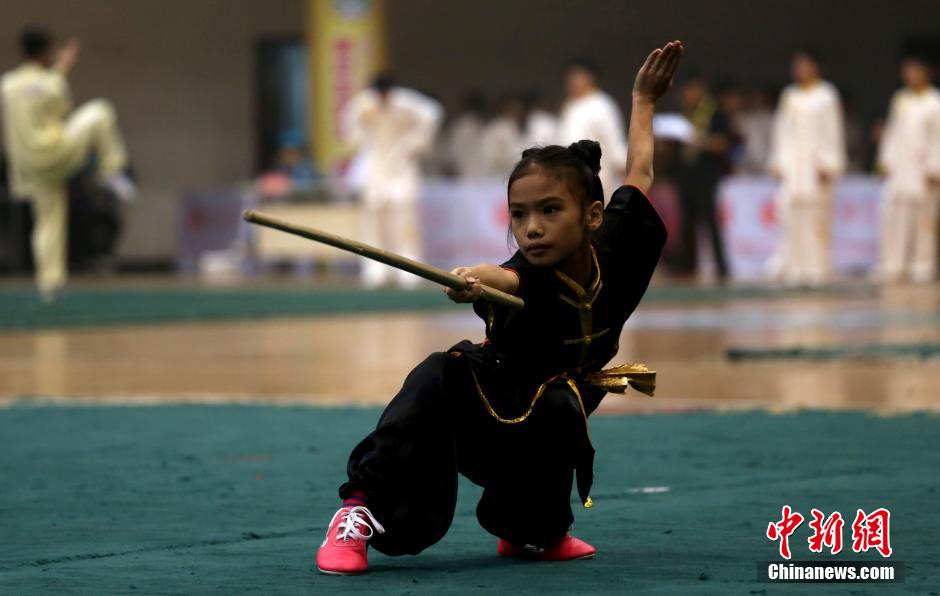 Competitor shows kung fu during the 10th Intl' Shaolin Wushu Festival in Dengfeng, central China's Henan province, Oct. 20, 2014. Nearly 2000 kung fu masters from 63 countries participated in the festival. (CNS/Yang Zhenghua)