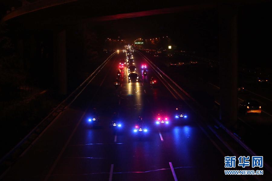 Motorcycle escorts pass Siyuanqiao, Beijing. Oct. 21, 2014.