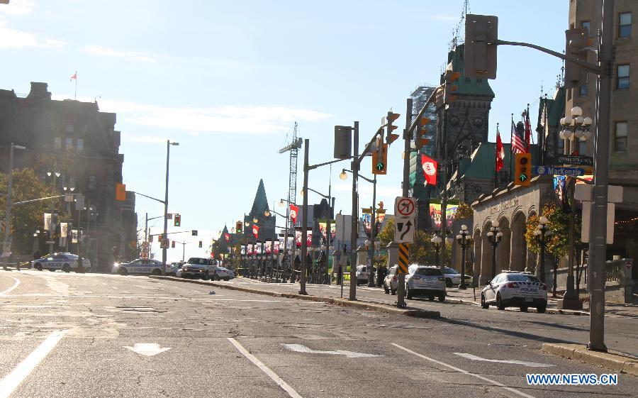 A street blanked off by policemen is seen near the Canadian parliament building in Ottawa, Canada, on Oct. 22, 2014. A Canadian soldier standing guard at the National War Memorial in Ottawa was gunned down and a security guard in the nearby parliament buildings wounded on Wednesday in an attack that police believe involved more than one gunman. (Xinhua/Li Baodong)