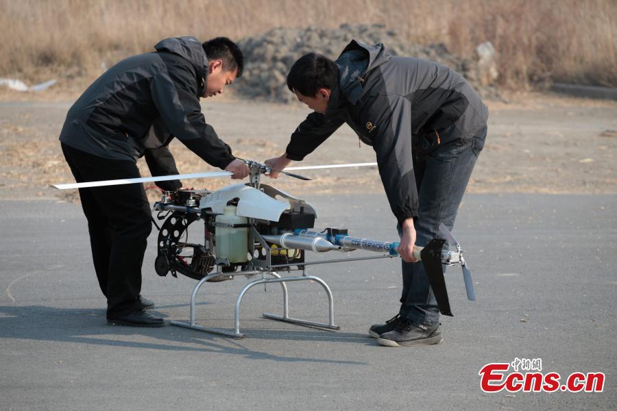 Two workers of environmental protection department prepare to fly an unmanned aerial vehicle which is designed to monitor illegal straw burning in Harbin, Heilongjiang province on October 22, 2014. [Photo: China News Service/ Wang Dongliang]