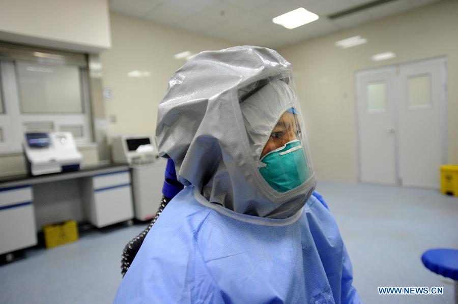A medical worker takes part in a drill to deal with Ebola cases at the Guangzhou Eighth People's Hospital in Guangzhou, capital of south China's Guangdong Province, Oct. 23, 2014. Guangdong has ruled out possible Ebola cases as 43 people suspected of infection tested negative for the deadly virus. A total of 8,672 people from Ebola-ridden areas entered the province since August 23, and so far, 5,437 people have been discharged from medical observation. (Xinhua/Liu Dawei)