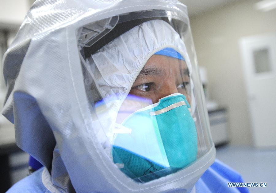 A medical worker takes part in a drill to deal with Ebola cases at the Guangzhou Eighth People's Hospital in Guangzhou, capital of south China's Guangdong Province, Oct. 23, 2014. Guangdong has ruled out possible Ebola cases as 43 people suspected of infection tested negative for the deadly virus. A total of 8,672 people from Ebola-ridden areas entered the province since August 23, and so far, 5,437 people have been discharged from medical observation. (Xinhua/Liu Dawei)