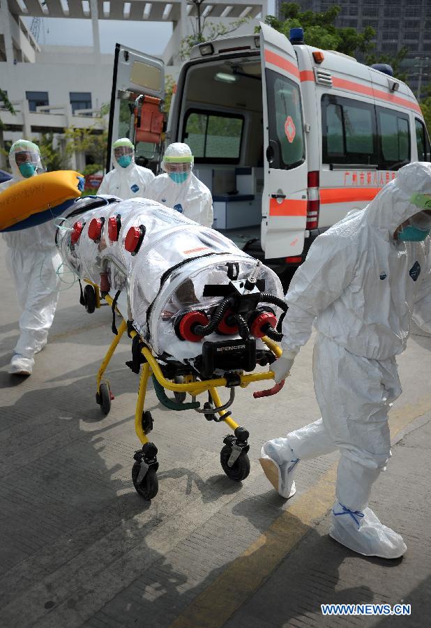 Medical workers take part in a drill to deal with Ebola cases at the Guangzhou Eighth People's Hospital in Guangzhou, capital of south China's Guangdong Province, Oct. 23, 2014. Guangdong has ruled out possible Ebola cases as 43 people suspected of infection tested negative for the deadly virus. A total of 8,672 people from Ebola-ridden areas entered the province since August 23, and so far, 5,437 people have been discharged from medical observation. (Xinhua/Liu Dawei)