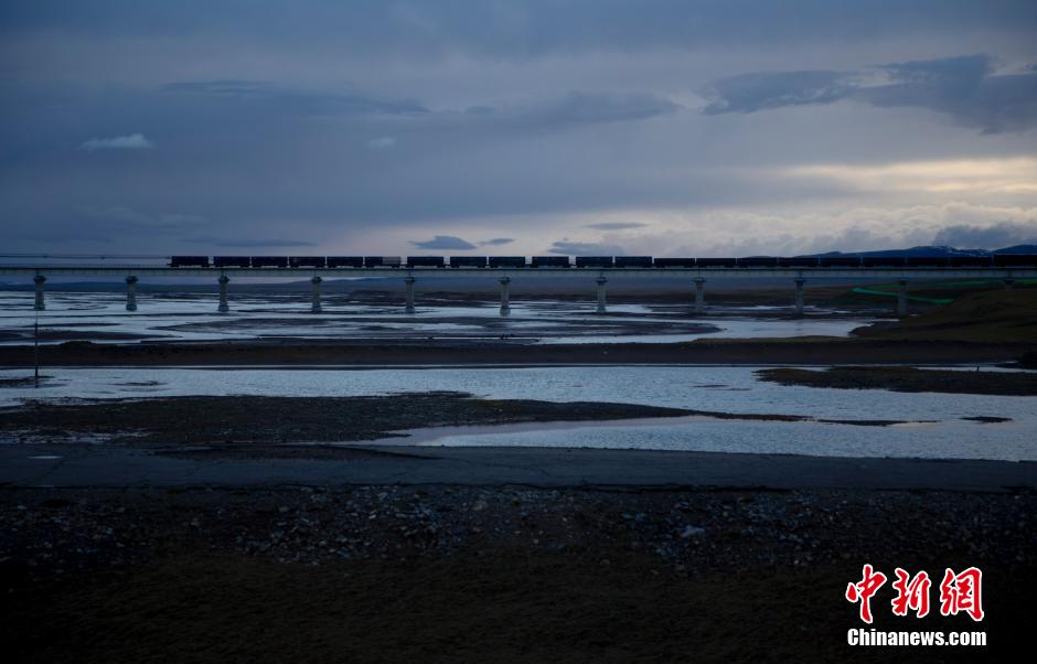 A train passes the Tuotuo River, September 26, 2014. Tuotuo River is a main source of Yangtze River. (Chinanews.com/Liu Guanguan)