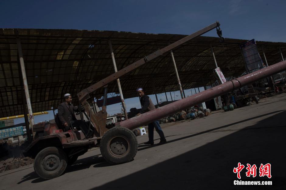 Two Muslims move steel in a steel market in Golmud City, northwest China's Qinghai Province, Sept. 24, 2014. (Chinanews.com/Liu Guanguan)