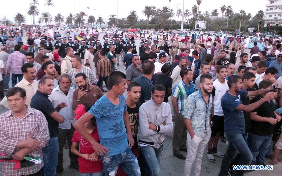 | Libyans attend a ceremony to mark the third anniversary of the declaration of the liberation from former leader Gaddafi, at the Martyrs' Square in Tripoli, capital of Libya, on Oct. 23, 2014. (Xinhua/Hamza Turkia) |
