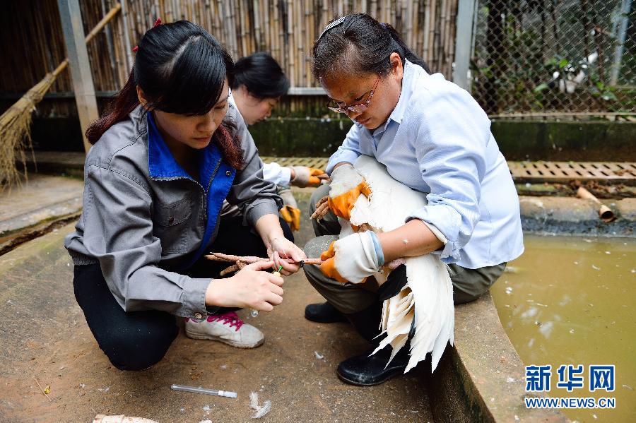 Chen Rong(L) draws blood for a Siberian crane - Sept. 17, 2014. (Xinhua/Li Xiang)