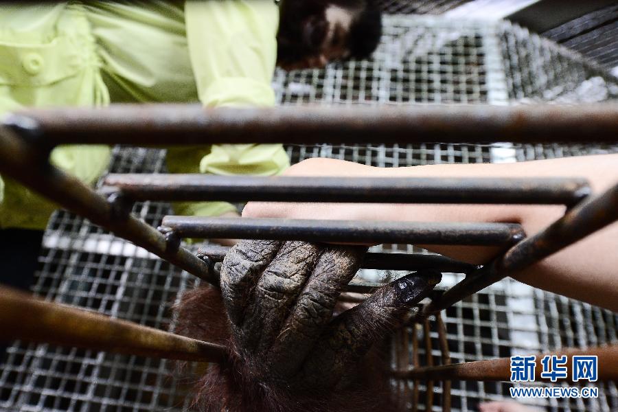 Chen Rong(L) collects a blood sample from an orangutan with the help of a breeder - Sept.17, 2014. (Xinhua/Li Xiang)