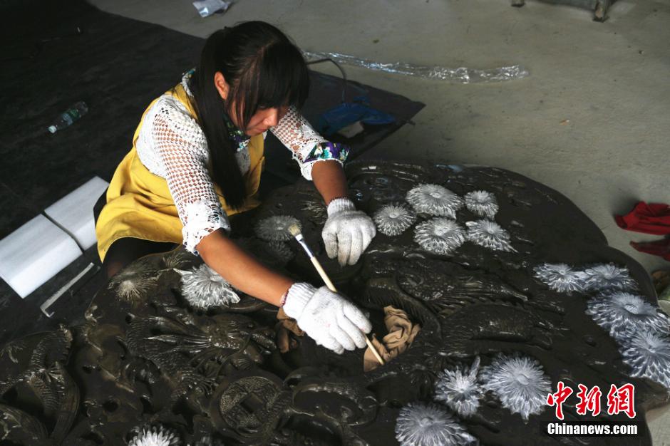 Chrysanthemum stone is formed in geological conformation movement. A gold medal winner in 1915 Panama World Expo, the chrysanthemum stone of Liuyang, central China’s Hunan Province enjoys great fame. As unique artwork of Liuyang, the chrysanthemum stone carving is famous for its sophisticated craftsmanship and high collection value. (Chinanews/Huang Shili)
