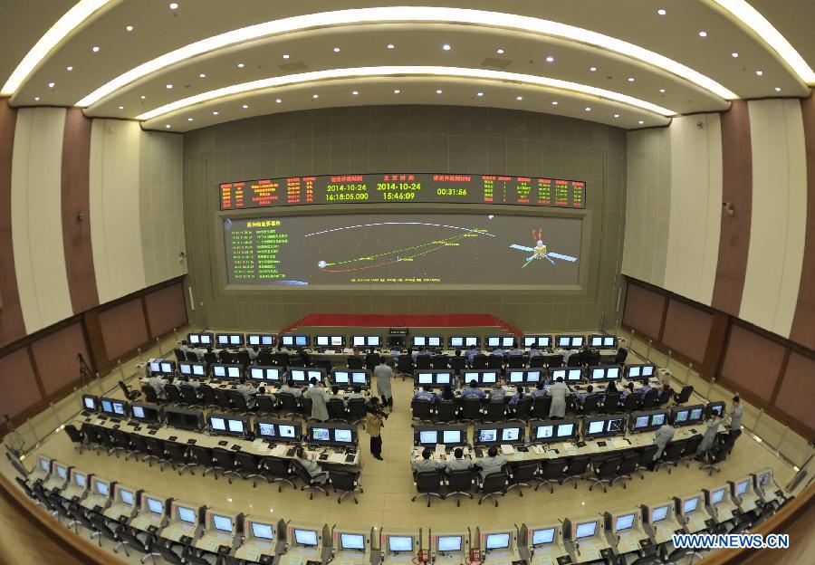 Technicians wait for the first adjustment of the test orbiter for lunar mission at the Beijing Aerospace Control Center, in Beijing, China, Oct. 24, 2014. The test orbiter made its first adjustment successfully at 4: 29 p.m. on Friday under technicians' accurate control. (Xinhua/Tian Zhaoyun)