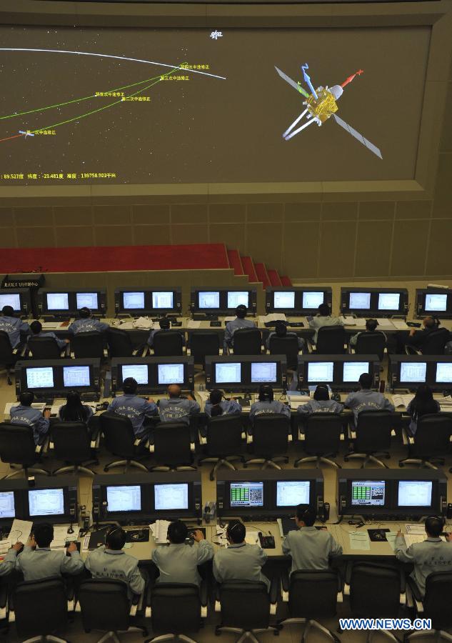 The screen shows the process of the first adjustment of the test orbiter for lunar mission at the Beijing Aerospace Control Center, in Beijing, China, Oct. 24, 2014. The test orbiter made its first adjustment successfully at 4: 29 p.m. on Friday under technicians' accurate control. (Xinhua/Tian Zhaoyun)