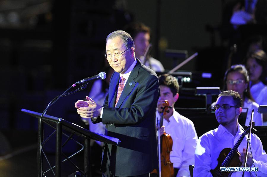 | UN Secretary-General Ban Ki-moon speaks during a concert entitled "Lang Lang and Friends" in commemoration of the UN Day, at the UN headquarters in New York, on Oct. 24, 2014. The United Nations celebrated its 69th birthday with its messenger of peace, world-renowned pianist Lang Lang performing at a concert on Friday evening. (Xinhua/Niu Xiaolei) |