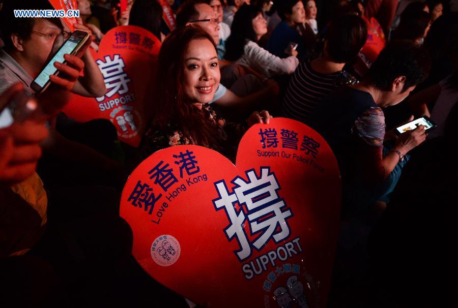 Citizens take part in an evening party held to bless Hong Kong and support local police at a square in Tsim Sha Tsui, Hong Kong, south China, Oct. 25, 2014. (Xinhua/Qin Qing)