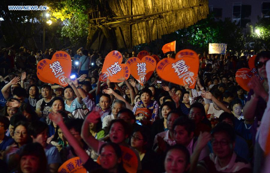 Citizens take part in an evening party held to bless Hong Kong and support local police at a square in Tsim Sha Tsui, Hong Kong, south China, Oct. 25, 2014. (Xinhua/Qin Qing)
