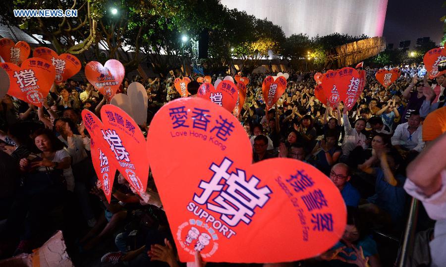 Citizens take part in an evening party held to bless Hong Kong and support local police at a square in Tsim Sha Tsui, Hong Kong, south China, Oct. 25, 2014. (Xinhua/Qin Qing)