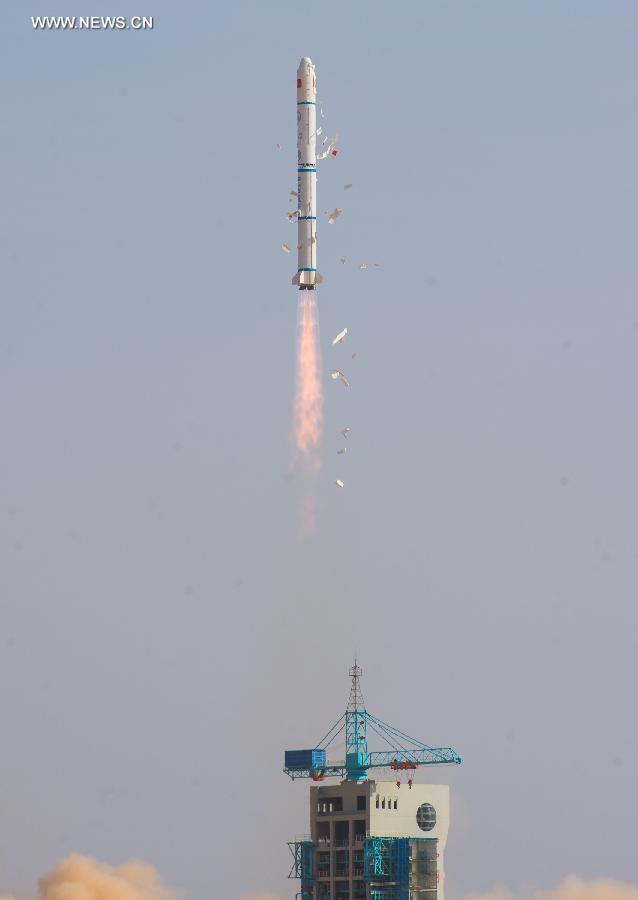 A Long March 2C carrier rocket carrying the Shijian-11-08 experimental satellite leaves the launch pad at the Jiuquan Satellite Launch Center in Jiuquan, northwest China's Gansu Province, Oct. 27, 2014. The Shijian-11-08 satellite, which was launched from Jiuquan at 2:59 p.m. Monday, will be used to conduct scientific experiments in space. The launch marks the 197th flight of the Long March rocket series. (Xinhua/Li Xiang)