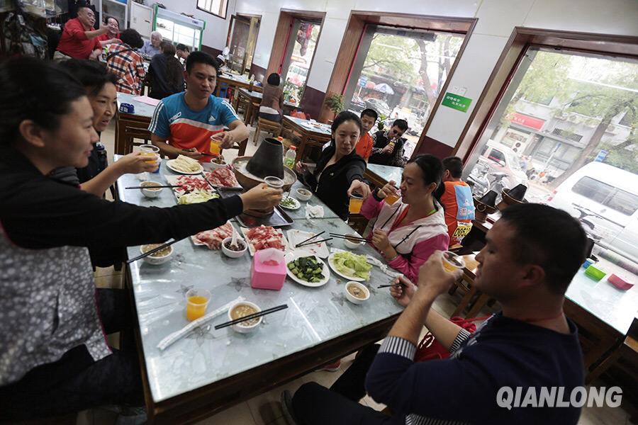 He Yajun has hot pot with his partners and coach on Oct. 19, 2014. (Qianlong/Li He)