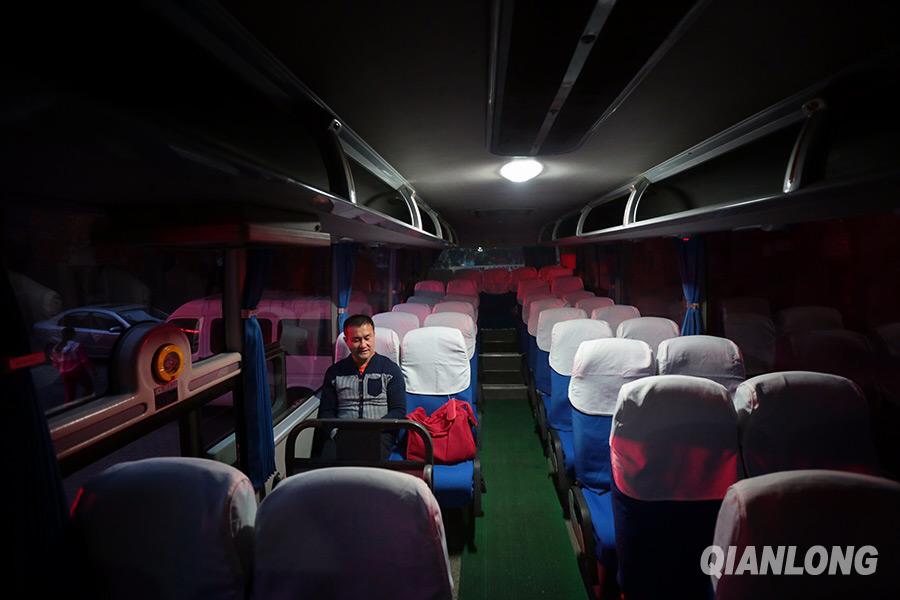 He Yajun gets on the bus on Oct. 19, 2014. He was very excited for the marathon competition. (Qianlong/Li He)