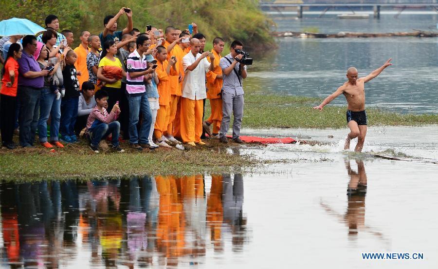 Shi Liliang, a monk from the Quanzhou Shaolin Temple performs Chinese Qinggong by running on water under thin plywood for about 118 meters in Quanzhou City, southeast China's Fujian province on Oct. 26, 2014. (Xinhua News Agency/Wei Peiquan)