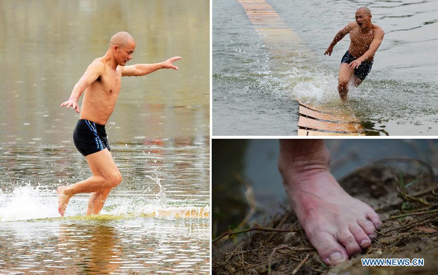 Shi Liliang, a monk from the Quanzhou Shaolin Temple performs Chinese Qinggong by running on water under thin plywood for about 118 meters in Quanzhou City, southeast China's Fujian province on Oct. 26, 2014. (Xinhua News Agency/Wei Peiquan)