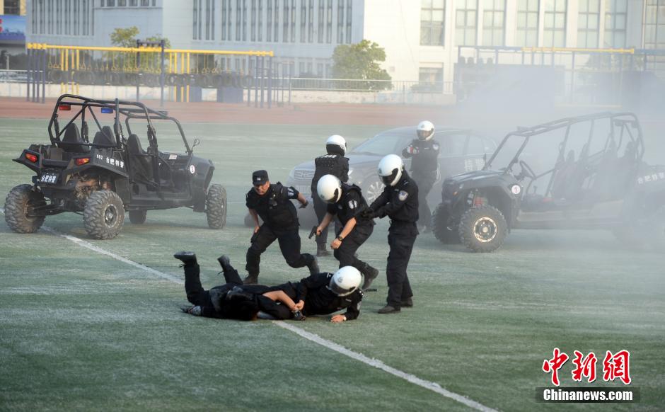 A comprehensive anti-terrorist drill is held in Hefei, central China’s Anhui province on Oct. 26, 2014. Over 600 emergency personnel and 77 emergency vehicles from eight emergency response forces, including special police, armed police, fire department, medical aid, etc., participated in the drill. (Chinanews/Zhang Yazi)