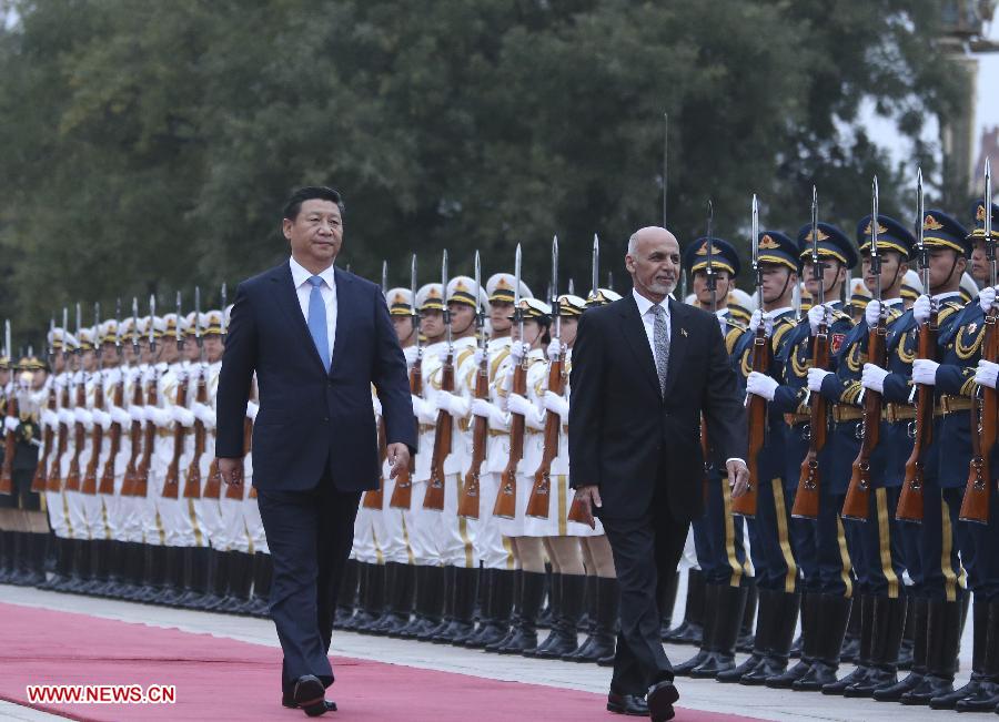 Chinese President Xi Jinping (L, front) and Afghan President Ashraf Ghani Ahmadzai inspect the guard of honor during a welcoming ceremony before their talks in Beijing, capital of China, Oct. 28, 2014. (Xinhua/Ding Lin)