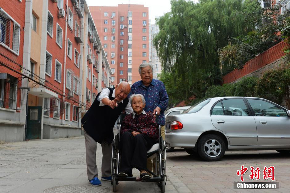 Zheng Chongqi, his wife and their mother walk outdoors. (CNS/Hu Qingming)