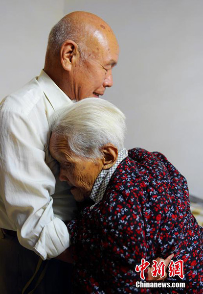 Zheng Chongqi carries his mother out of the bed. (CNS/Hu Qingming)