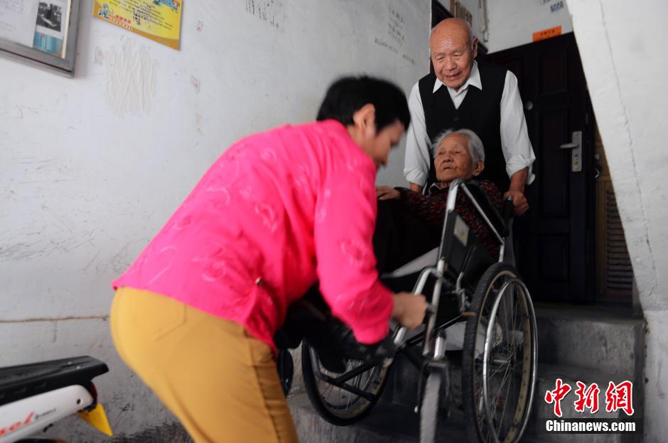 Zheng Chongqi carries his mother down the stairs with the help of his neighbor. (CNS/Hu Qingming)