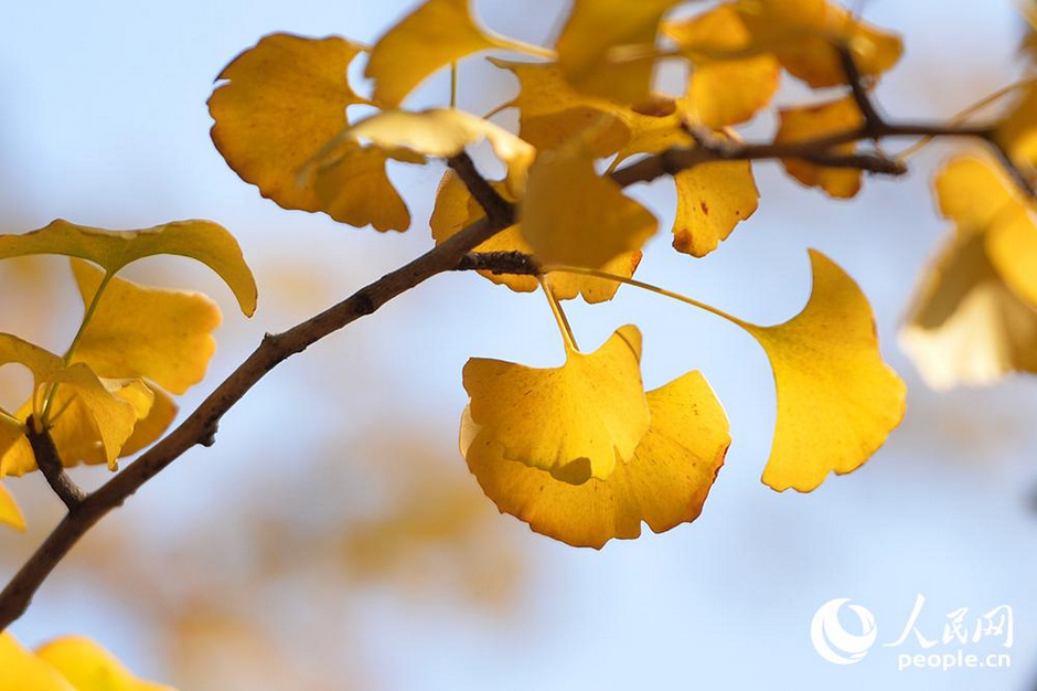 People enjoy the scenery of gingkgo leaves at Dongwujie in the Sanlitun area of Beijing on Oct. 27, 2014. The beautiful scenery of gingkgo trees in the city attract visitors every autumn. (People's Daily Online/Weng Qiyu)