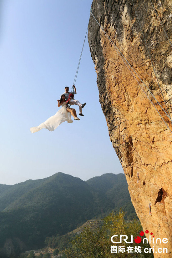 On October 26, 2014, a climbing fan and his wife climb to a 20-meter-high cliff to take their wedding photos in Jinhua, east China’s Zhejiang Province. (cri.cn)