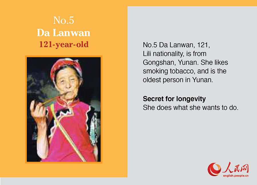 On Oct. 21, the Gerontological Society of China unveiled the list of the 10 oldest living people in China. Their average age is 119.7 years old. Of the 10, one is male and the others are female. They are from 7 provinces and 6 different ethnic groups. The three oldest ones are from Xinjiang.