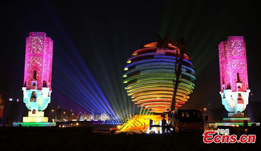 An APEC emblem-shaped light is turned on at an intersection in the Chaoyang district of Beijing, China’s capital on Wednesday evening, October 29, 2014. The emblem of the 2014 APEC meeting consists of 21 colored lines, which not only traces out the outline of the globe, but also the Temple of Heaven (Tiantan), a location for ritual ceremonies in ancient times. The emblem is a symbol of partnership and cooperation between APEC member economies. [Photo: China News Service/ Guo Junfeng]