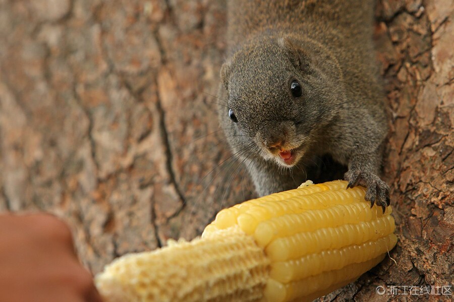 A squirrel in West Lake of Hangzhou enjoys the corn fed by a tourist on Oct. 27, 2014 in east China's Zhejiang province. (Photo/zjol)
